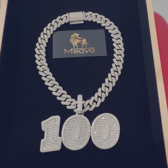 Make a bold statement with this premium custom “100” iced-out pendant, designed to be the centerpiece of the necklace. Crafted with dense AAA rhinestones and a detailed, high-shine finish, the pendant delivers maximum brilliance and presence—making it the true value and highlight of this piece.